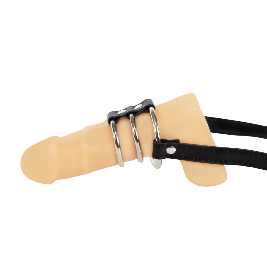 Anillo para el pene con tres aros metálicos y correa de cuero sintético para amarrar a la cintura y darle mayor y estabilidad.