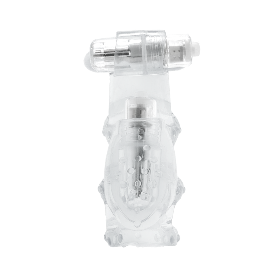 Anillo para el pene con extensión de funda en forma de anillos y doble bala de estimulación.