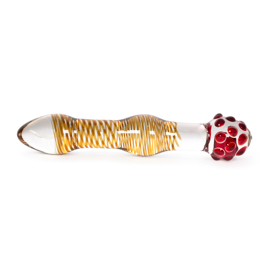 Dildo de vidiro con tres texturas diferentes. En un extremo tiene un círculo con pequeños nódulos perfectos para masajear y estimular el punto G.