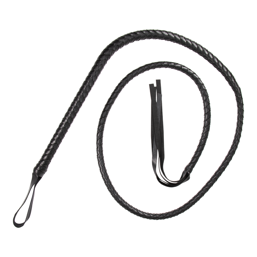 Látigo extragrande en cuero sintético entrelazado con forma de trenza y tiras en la punta.