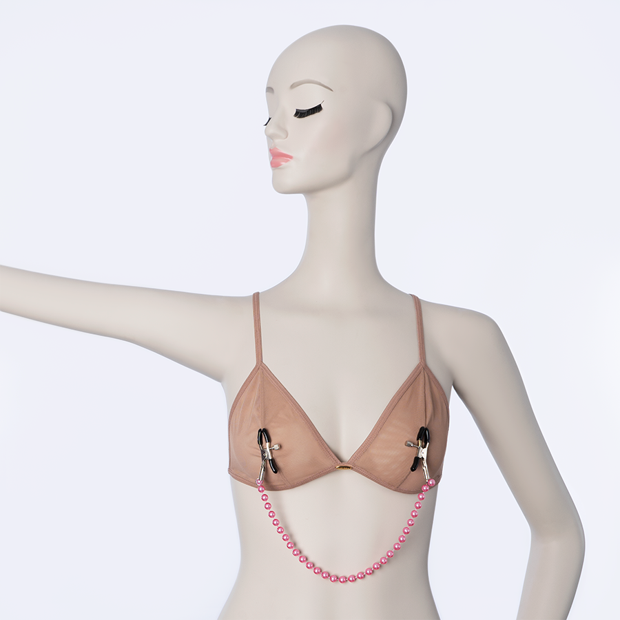 El tornillo delantero aumenta la presión. Las pezoneras están unidas por una cadena de perlas rosadas.
