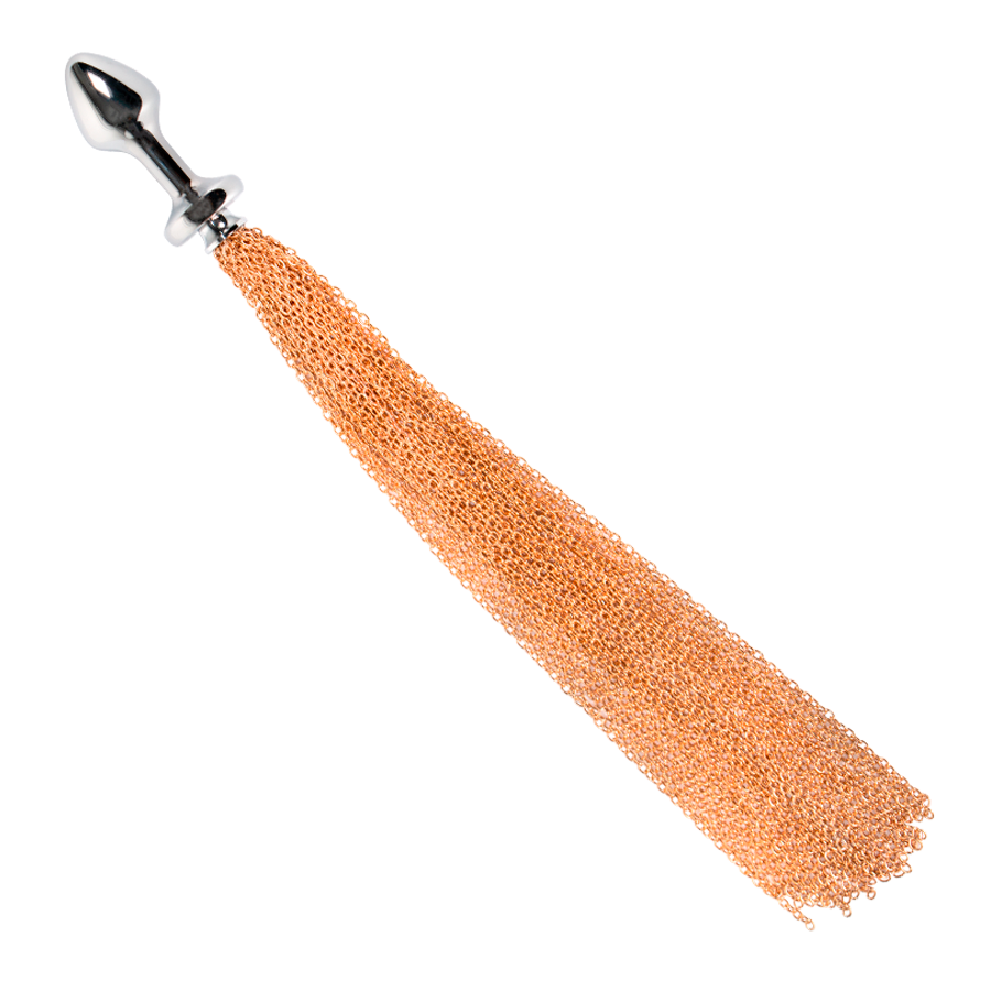 Plug metálico para uso anal con extensión en la base de pequeñas cadenas que forman una cola.