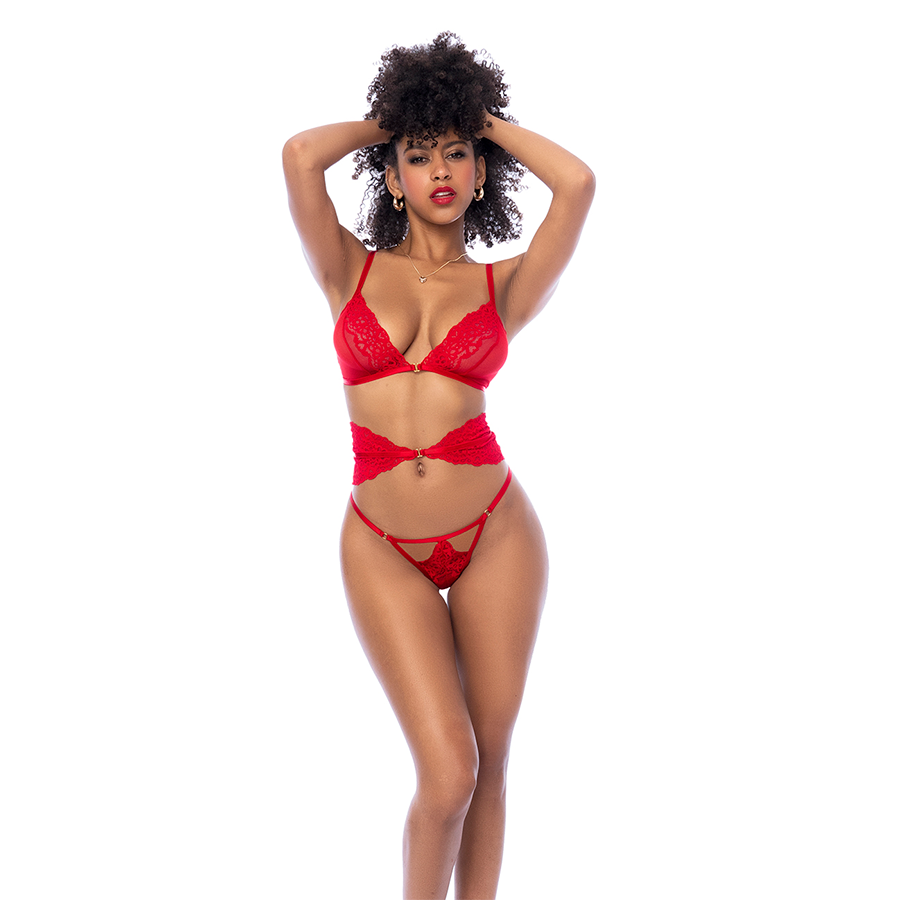 Set de tres piezas en encaje de corazones. Incluye top con cargaderas ajustables, cinturilla y panty a juego.